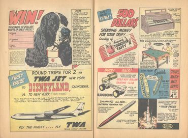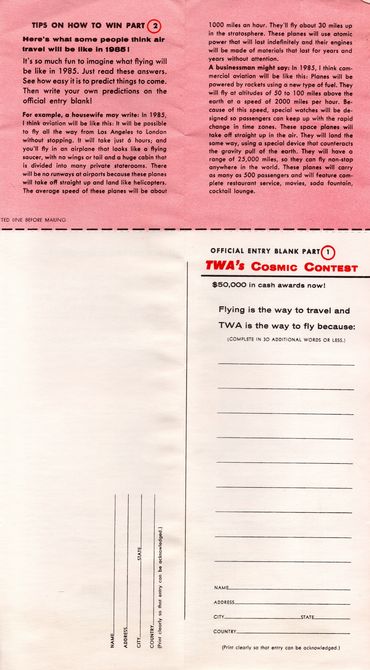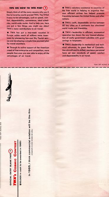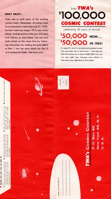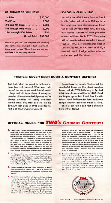 The Cosmic Contest was one of the features of TWA's celebration of its 30th year of service in 1955. It consisted of two parts, the first of which offered a prize of $50,000 (representing 18 states in the U.S., plus Canada, England, India and Switzerland) for the best 30-word statement on the merits of air travel. The contest was compelling enough to attract several luminaries as judges, among-them Walt Disney and Jacqueline Cochran.