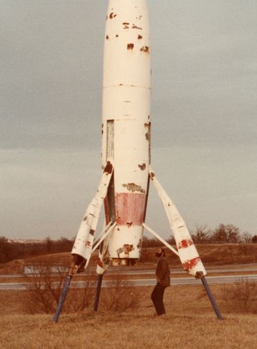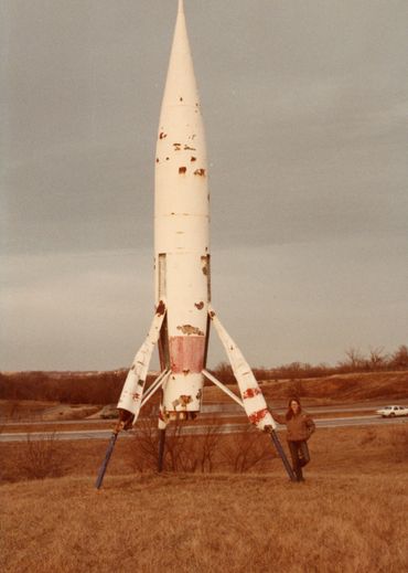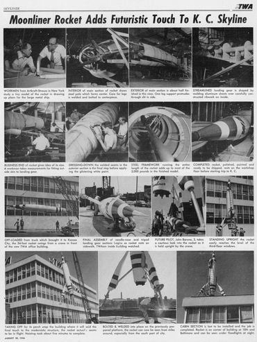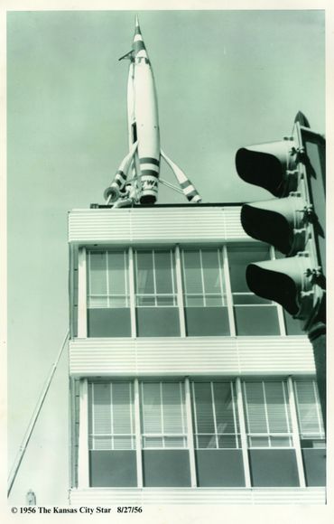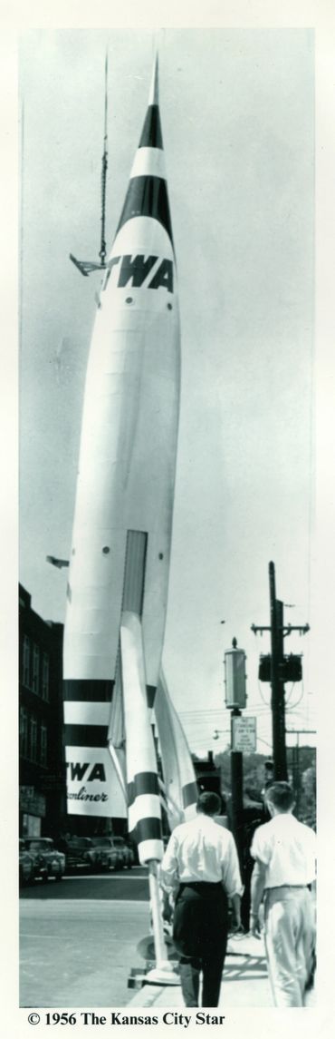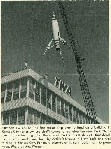 In 1956, Hughes had a 32.5-foot-tall scale model of the Disneyland Moonliner, known as the Moonliner II, built in New York City, placed on the southwest corner roof location of TWA's then-new office building at 1735 Baltimore in Kansas City. It remained there until 1961, when the partnership with Disney ended and it was removed. It was sold in 1962 to Space Craft, an Independence, Missouri manufacturer of travel trailers and RV units. The Moonliner and Space Craft later moved to Concordia and the rocket was placed near the south side of I-70 between St. Louis and Kansas City at the Space Craft assembly plant.