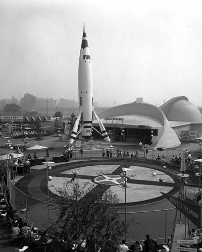 From 1955 through 1962, the TWA Moonliner was part Disneyland's Tomorrowland in Anaheim, California. Tomorrowland is one of the five "themed lands" featured at the original Disney theme park. Tomorrowland's centerpiece was the TWA Moonliner, influenced by Disney's "Man in Space" television episodes developed in the 1950s. At 76-feet tall, the Moonliner was the tallest structure in the park, even taller than the park’s iconic Sleeping Beauty Castle. Even at this enormous scale, the rocket was still only a roughly one-third scale replica of the envisioned 200+ foot Moonliner. The Moonliner symbolized the “Rocket to the Moon” attraction, which was a simulated ride around the Moon and back to Disneyland.